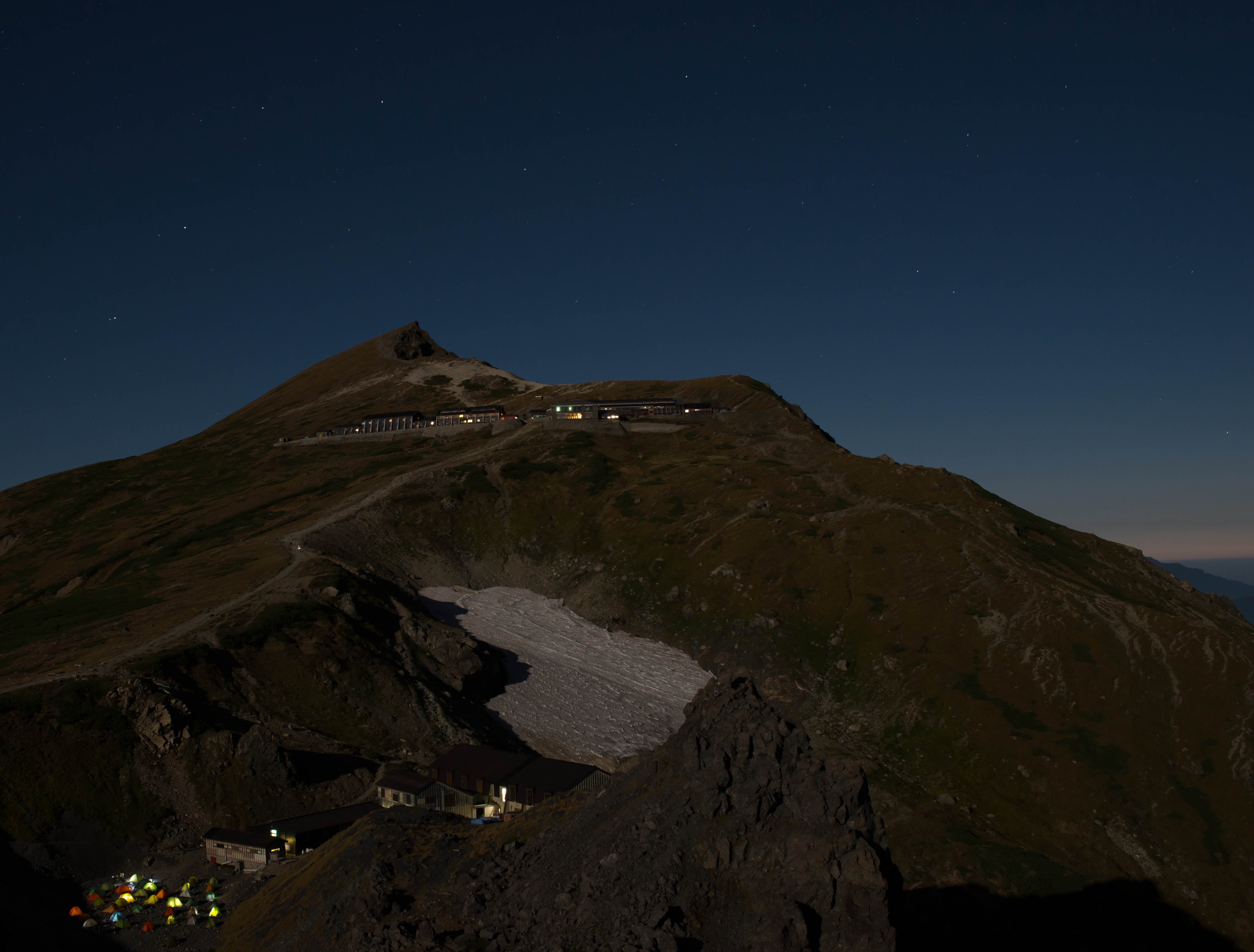 撮影日 平成25年9月20日 満月(中秋の名月) AM 4:18 撮影場所 北アルプス白馬岳丸山にて 解 説 満月の光の下、白馬岳は月の光で照らされていた。上部の山荘が白馬山荘、下部が白馬岳頂上山荘で、その下にはテント場がある。