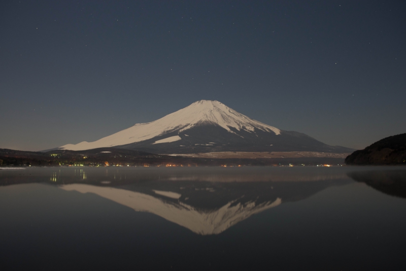 撮影日 平成26年1月16日 AM 0:12 撮影場所 山中湖平野にて 解 説 満月の夜、静かな湖面は鏡のように富士山の美しさを映し出していた。