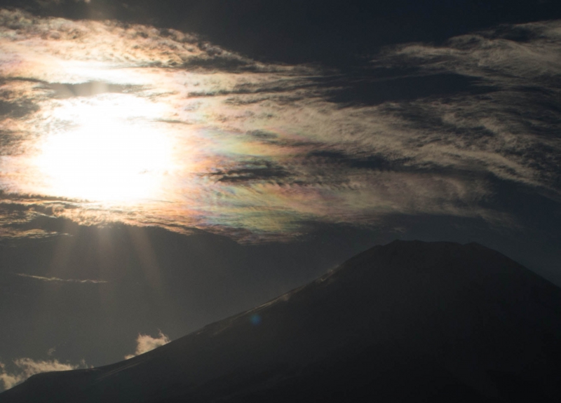 撮影日 平成26年1月15日 PM 3:30 撮影場所 山中湖長池にて 解 説 太陽の近くを通りかかった雲が五色に光った。彩雲は昔から吉兆とされ、「五色の彩雲」とも呼ばれている。また、阿弥陀如来が西方極楽浄土から菩薩を隋えて五色の雲に乗ってやってくる来迎図に描かれていて、瑞相の一つとして知られている。