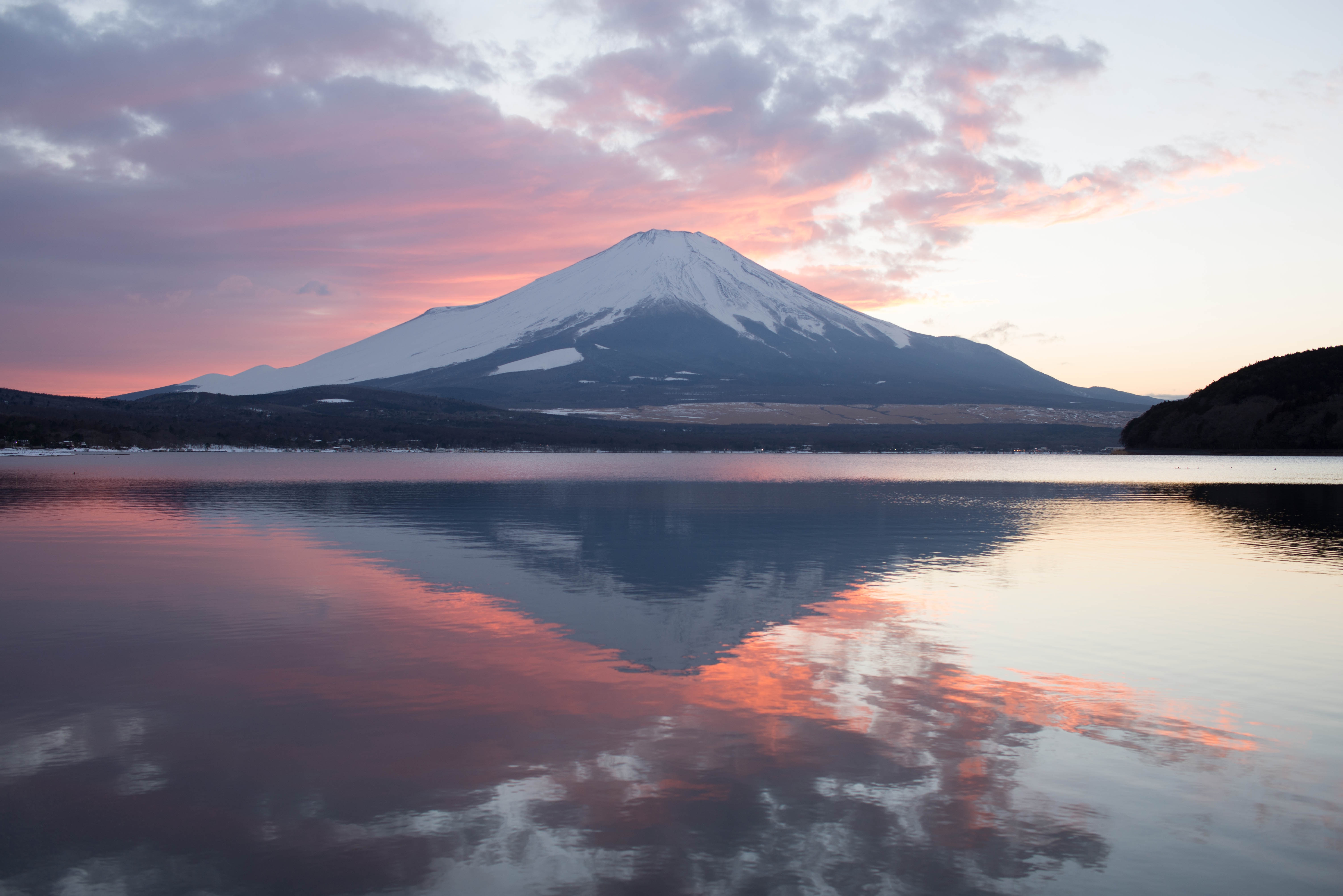 撮影日 平成26年1月15日 PM 5:01 撮影場所 山中湖平野にて 解 説 夕陽の時間帯に富士山の背景に雲がでてきた。陽が沈む時、雲は赤く焼け始め、湖面は静かにその景色を映し出していた。
